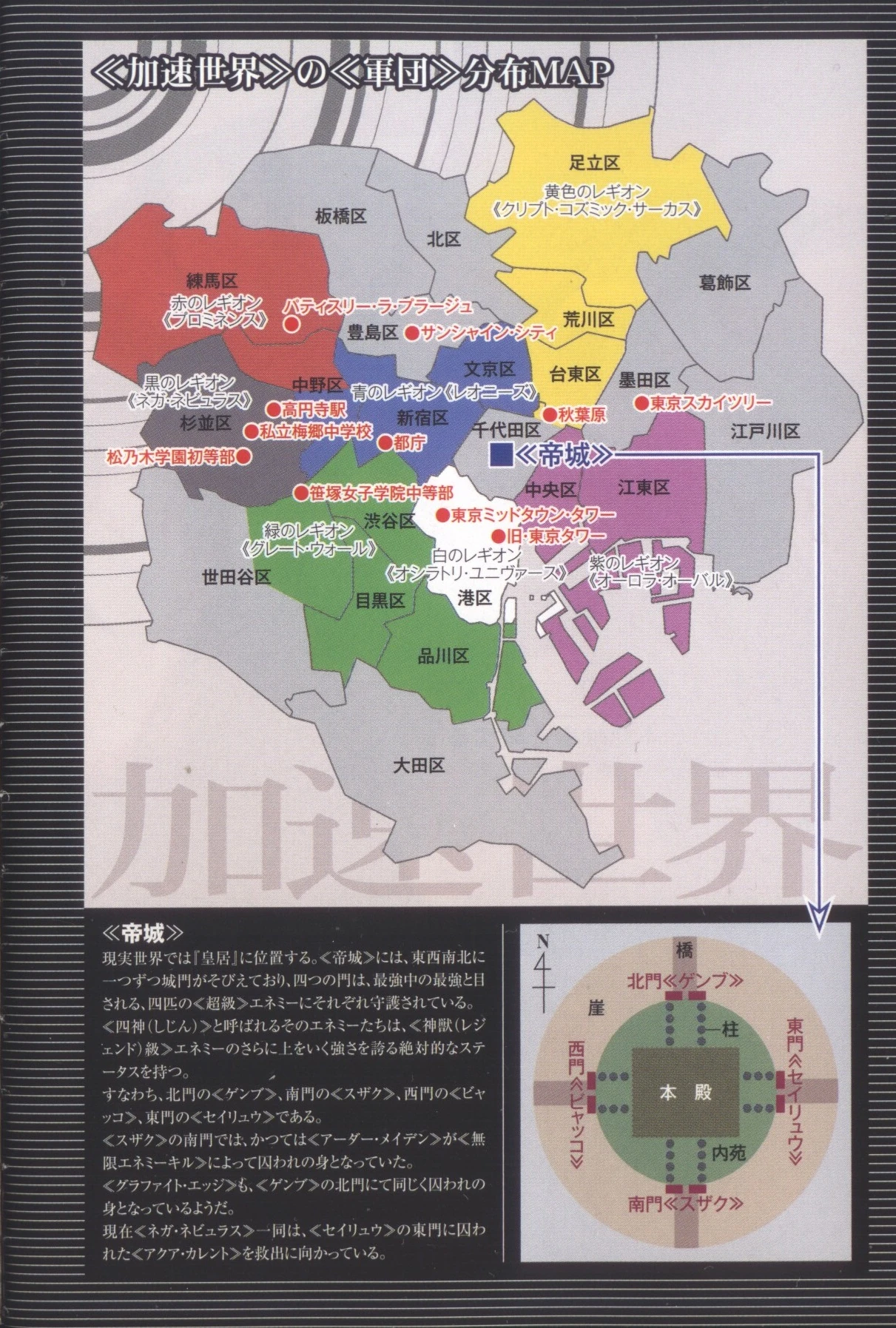 Chaque Légion possède un "territoire" compris parmi les 23 quartiers de Tokyo. Dès lors que l'identité réele d'un membre d'une Légion se trouve dans l'un des territoires de sa légion, le Burst Linker peut se connecter au Réseau Global sans être soudainement provoqué en duel par un autre Burst Linker dans le quartier.