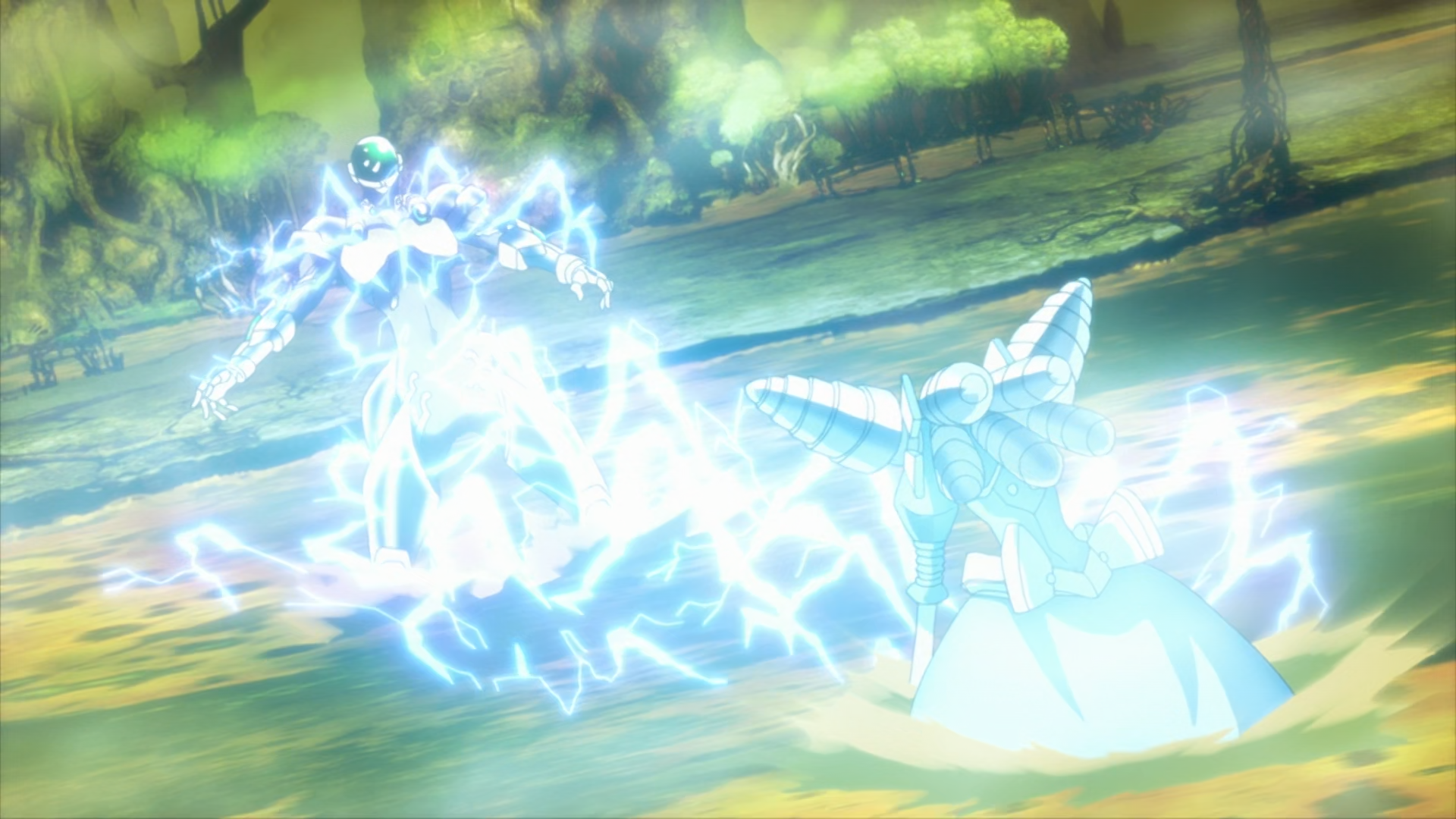 Charging towards her, Haruyuki attempts to use his special attack “Headbutt”. However, Nickel Doll counters with a shock of electricity, repelling him backwards. After a couple of quick exchanges, both are thrown into the poisonous swamps dotting the map. Haruyuki realizes that this situation was tilted towards his advantage, as his silver armor was resistant to poison. However, Nickel Doll thrusts her hands into the super-conductive swamp water and activates her special move “Anode-Cathode”. Victoriously exclaiming that silver was the best electrical conductor among all metals, she continues to pulse electricity into Silver Crow’s avatar body.