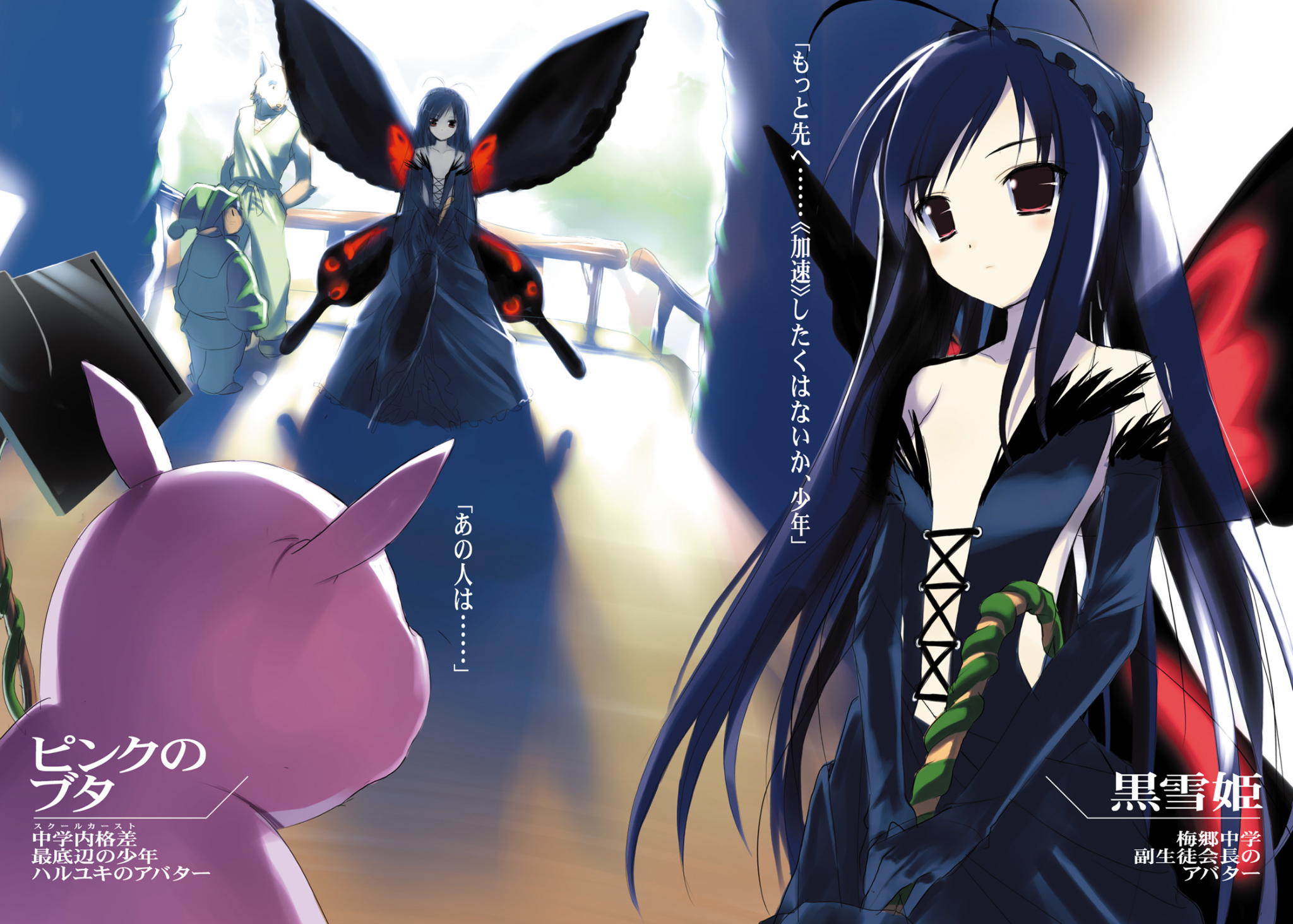 Kuroyukihime is Haruyuki’s “Parent”, the person who had given him Brain Burst. Impressed by his virtual squash high scores, she had initially recruited him to help with Cyan Pile’s attacks. Because of his low self-esteem, Haruyuki had initially been suspicious of her reach, asserting that she should simply use him as a tool and throw him away when she was done. However, after Kuroyukihime was put into critical condition after sacrificing herself in a car crash orchestrated by Araya, Haruyuki realized that her feelings towards him were genuine. At this revelation, he pledges to support her on her journey throughout the Accelerated World.