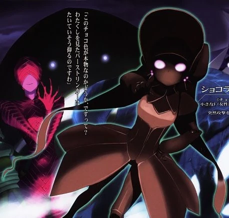Chocolate Puppeteer, as her name suggests, is an avatar covered by chocolate-colored armor, placing her somewhere between yellow and red. Her armor also tastes like chocolate.[4] She has long hair flowing down to the left and right of her bonnet, as well as dress-shaped armor for her lower body. Her eyes glow the color of strawberry cream, according to her.[5] However, even though the avatar looks and tastes like chocolate, the armor itself is not actually chocolate. As such, it does not melt or break easily. Chocolate Puppeteer's potential is largely based on her ability to create chocolate puppets.